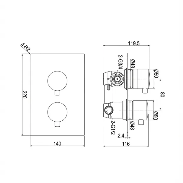 • 2 x outlets ideal for shower head + hand shower or body jets